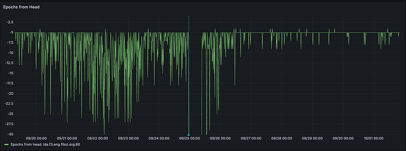 There were a couple of cases of F3 stalling to make progress after its April activation (1, 2). These events resulted in a whole set of resiliency and performance improvements within go-f3 that the whole network has now adopted. Now that these improvements have been deployed, they’re already showing their impact in the week after the network upgrade. For example, F3 has been staying within 10 epochs from head.