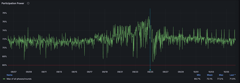 /v1Ethereum APIs to be “F3 aware” as discussed above certainly helps. But there is more to do, and we’re tracking partner adoptions here! - Increase participation — Looking at the last ~30 days, F3 participation below continues to average around 72%. While this is above the 66.6% requirement, it still leaves us more susceptible for stalls (as we saw during the nv27 upgrade). Tooling has been built to highlight SPs not participating in F3 (example slack thread), but the right long term solution is to incentivize participation.