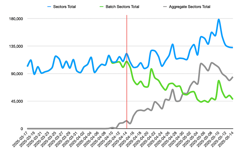 The network should aim to minimise the number of batched sectors to create a cycle of benefits. Beyond lowering onboarding costs per sector for Storage Providers (SPs), increased aggregation adoption can deliver: